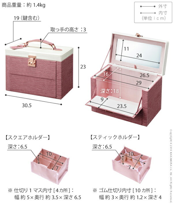 【カラーバリエーション】 ブラウン・ピンク 【仕様】 本体(外貼り):合成皮革(PVC) 本体蓋(外貼り):合成皮革(PVC) 内貼り:ポリエステル100%(撥水加工) 芯材:繊維板 ◎完成品 【サイズ】 幅30.5x奥行19x高さ23cm 重量:約1.4kg 本体内寸:幅29(26.5)x奥行16x高さ18cm ミラーサイズ:幅24x高さ11cm・フチ2cm フラップ部:幅23.5x奥行9cm コンテナ内寸:幅10x奥行7x高さ6.5cm コンテナ(4仕切り1マス):幅約5x奥行約3.5x高さ6.5cm(x4マス) コンテナ(ゴム仕切り):幅約3x奥行約1.2x高さ4cm(x10箇所) 持ち手立ち上がり:3cm 株式会社ナカムラ(A0800028)